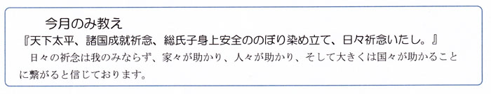 10月を迎えました。まずは、暑さが和らぎ過ごしやすい秋を期待いたします 。10月を神無月と呼びますが、全国の神様たちが揃って出雲大社に集まるために神様がいなくなるという意味と教えられます。逆に、出雲の人たちはこの月を神在月と呼ぶようです。み教えに『親神様は天地を回り巡って万物を守り、生かして下さっている神様である。此方は、日天四月天四、金乃神様と申して拝礼し信心している。人間はみな天地金乃神様から人体を受け、御霊(みたま)を分けていただき、日々天地の調えてくださる五穀をいただいて命をつないでいる。昔から、天は父なり、地は母なりというであろう。天地金乃神様は人間の親様である。此方の信心をする者は、一生死なぬ父母に巡り会い、おかげを受けていくのである。』とありますように、この神様はどの月に関わらず日々に天地があられる限りお働きくださると教え下さり、日々に神在(かみあり)であることを解れるわけですから、真に有難いことです。ですから日々に年中に神様にお世話になり生活をさせて頂いておることを忘れずにおりましたら、信心になってまいります。 もっとも教祖様(生神金光大神様)が信心のお道開きの御用を下さり、数々の教えを残して下さりましたのは、我々子々孫々に至るまで助かるようにとの真に深い祈りがあられてのことです。 今年は教祖様140年の御年で、その記念の御祭りがこの月に御本部で仕えられ、後、順に各地の教会で仕えられます。神津教会は11月19日(日)に仕えられます。どうぞ皆様が参拝のおかげを蒙られますことを願ってまいります。それでは今月も皆様の立ち行きを願わせて頂きます。9月を迎えまだまだ残暑の日々が予想されますが、旧暦の上では夏真っ盛りです。17日(日)には、秋の霊祭が仕えられます。霊様は我々の親ご先祖であると同時に、我々にご信心を教え下される神様、霊の神様であられます。 教えに『ご信心しておくがよい。ご信心してあなたがおかげを受けると、あなただけではない、後々の孫、ひ孫の末の末までがおかげを受けるし、また、ご先祖の精霊御霊までが、あなたがご信心して、おかげを受けてくれるからと、安心してお浮かびなさる。あなたの受けたおかげは、いつまでも離れずについてゆくものであるから、できるだけこの世でご信心して、おかげのもとを作っておくがよい。』とあります。 この教えからも分かりますように、霊様は形式的には教会のご霊殿やお墓に鎮まれておられるということになりますが、その魂は鎮まれることなく、常に我々の前に立ち後ろに添うごとく我々を教え導こうとなされておられます。と同時に我々に末の末までもおかげを頂けるようにご信心下さいと期待をかけて下さっておられるのです。 また霊様はお盆のお墓参りもそうですが、春秋の霊祭りを心待ちになされておられます。この秋の9月にも例年通り仕えられますが、秋という言葉にかけまして、その思いは「一日千秋の思い」かと感じるのです。「一日が千年にも 長く思われるほどに待ち遠しい」という具合の意味でしょう。このように霊様、神様の願いはたいそうに大きなものですが、我々の日常というのは、信心させて頂いておると申しましても、なかなかに目先、目先のおかげを追い求めるばかりで、気づけばお詫びばかりとも思うのですが、どうでもそのように過ごさせて頂けますのも、霊様・神様のお徳があってのことと有難く思わせて頂くものです。どうぞ皆様共々に霊様・神様の思いを頂き、この秋の霊祭のご参拝のおかげを蒙らせて頂きましょう。それでは今月も皆様の日々の立ち行きを願わせて頂きます。