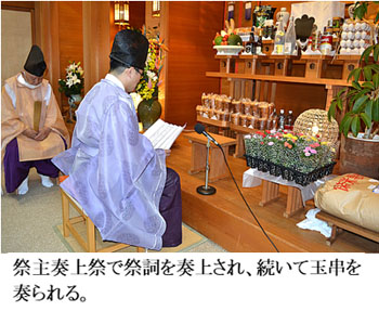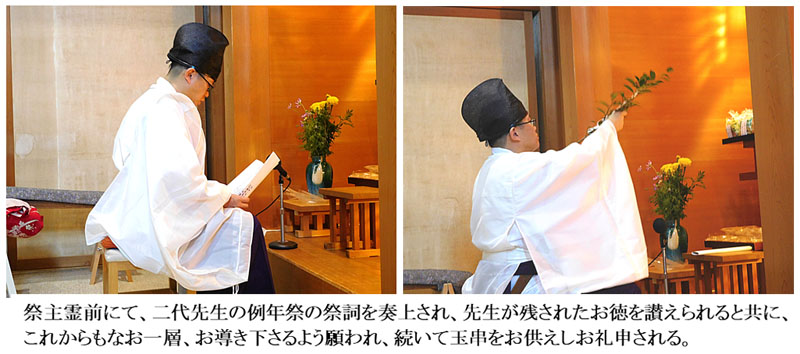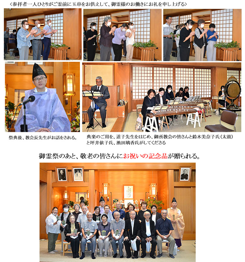 ) 月例祭並びに二代教会長鈴木弘大人の例年祭が仕えられました。 二代教会長 鈴木 弘先生は、平成3年9月8日に 神上がられましてより今年は32年になり、 月例祭に併せて例年祭が、教会長 鈴木清隆先生の もとに、お仕えになりました。 そして参拝者一人ひとりが先生のご霊前に玉串を お供えし、お徳を偲ばせて頂き、お礼を申し上げました。 ≪霊前 二代教会長 鈴木 弘大人の例年祭≫ ![]() ≪霊前 二代教会長 鈴木 弘大人の例年祭≫ ![]() <<神前奏上祭>> 9月17日(